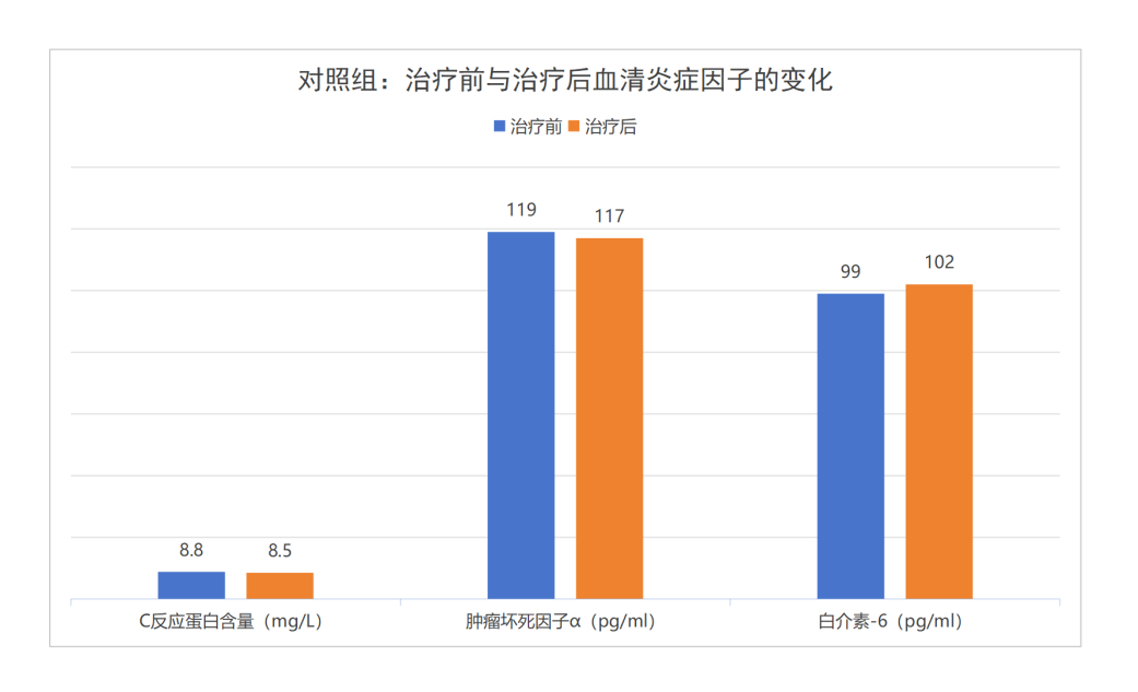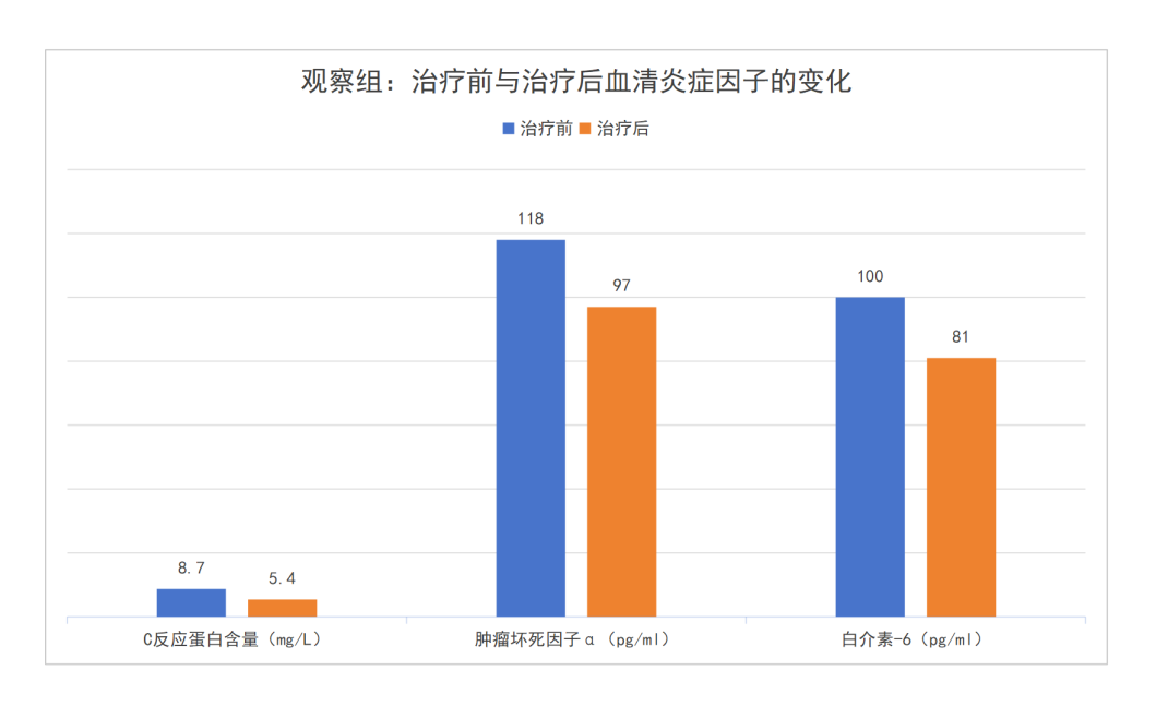 觀察組:治療后各類炎癥因子均顯著下降,其中C反應蛋白直接降至安全范圍,微炎癥狀態得到有效改善。